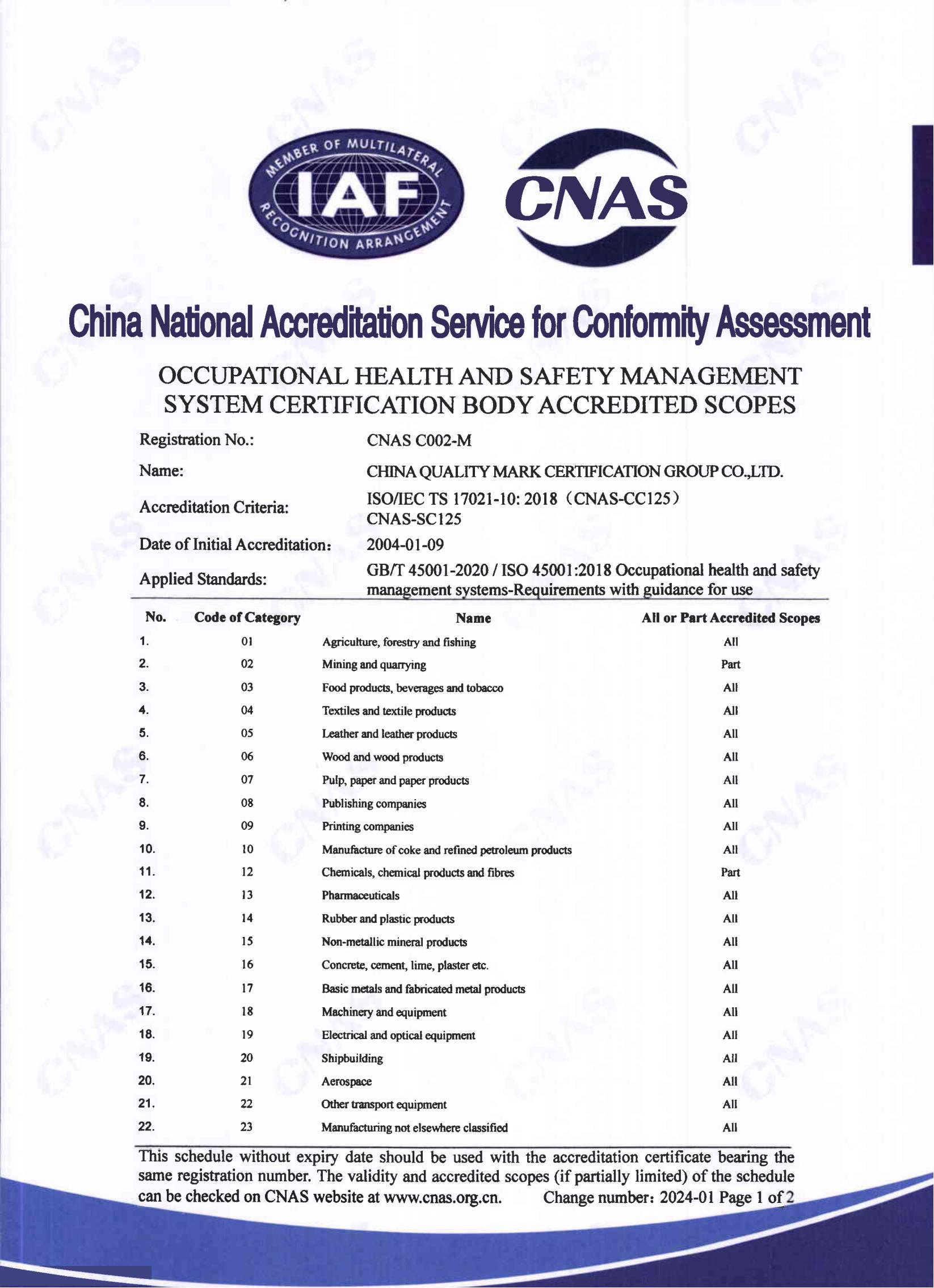 職業健康安全管理體系認可證書