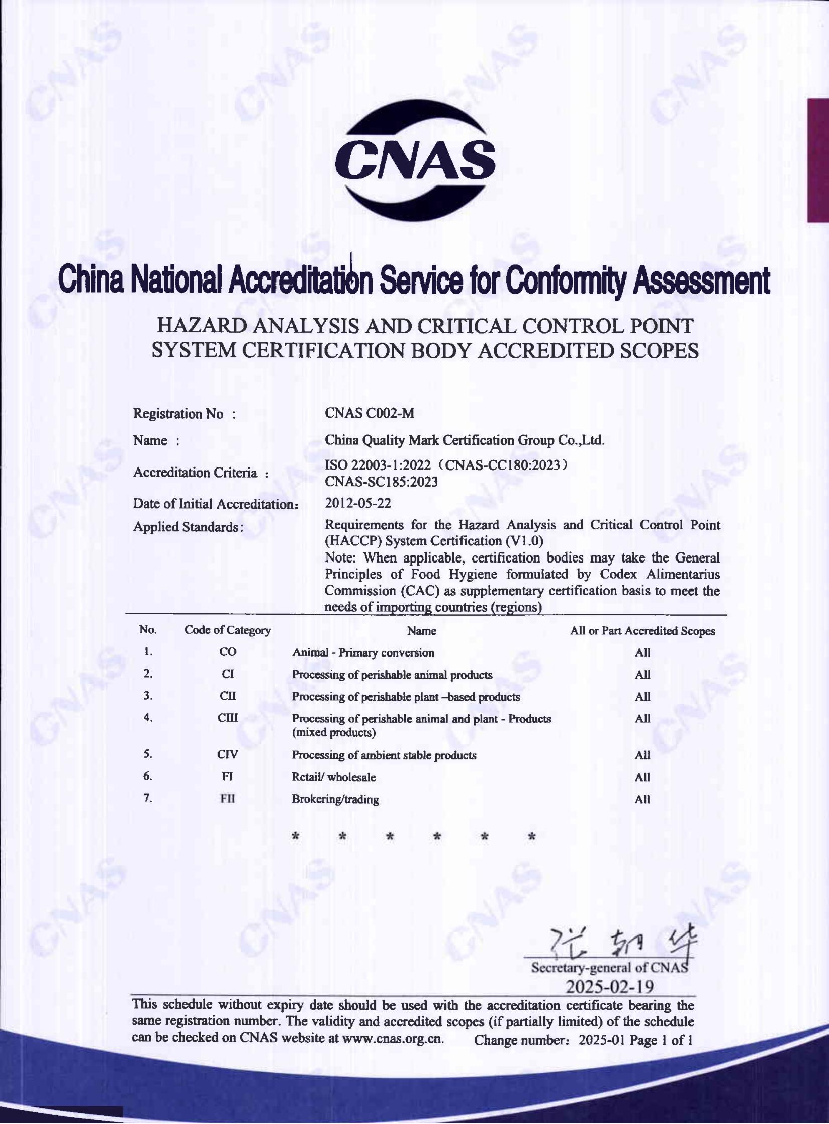 危害分析與關鍵控制點(HACCP)體系認可證書