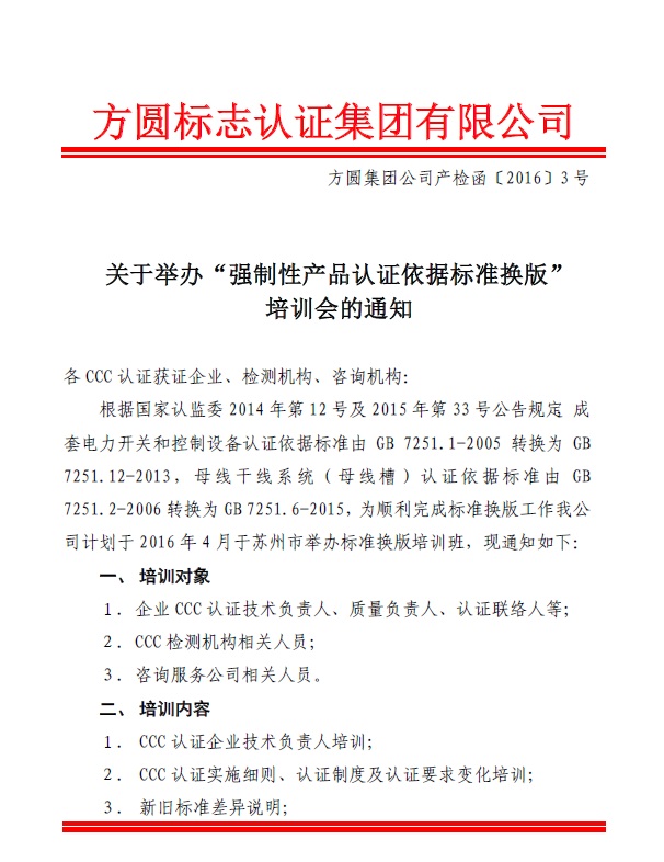 關于舉辦“強制性產品認證依據標準換版”培訓會的通知
