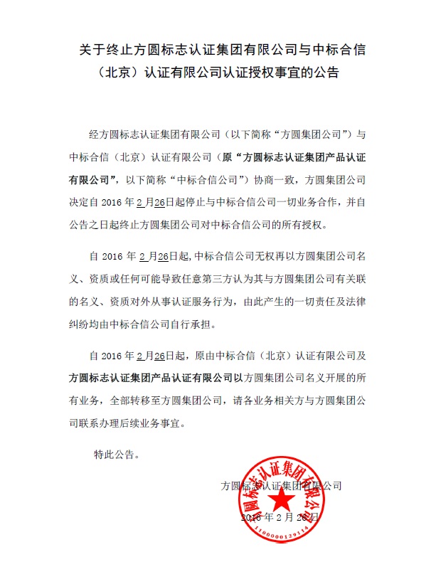 關于終止方圓標志認證集團有限公司與中標合信(北京)認證有限公司認證授權事宜的公告
