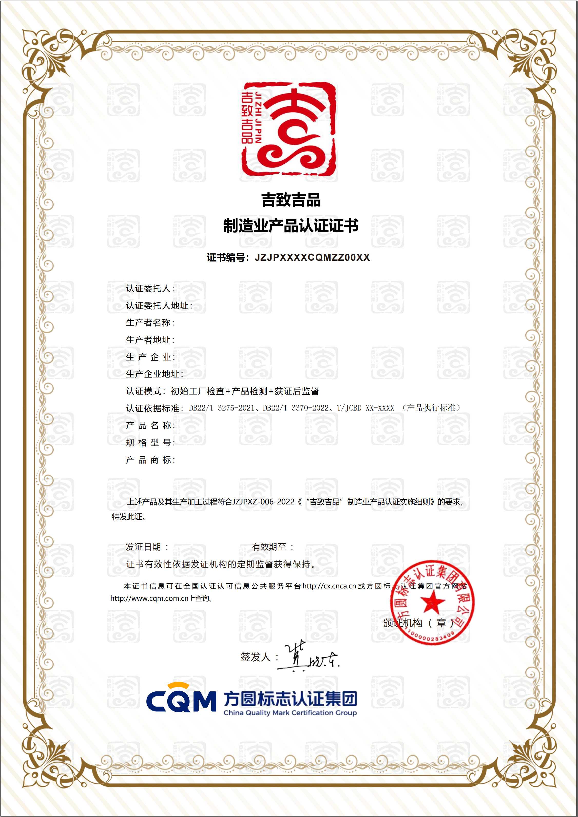 標識寓意:“吉致吉品”標識,是吉林省區域品牌認證標識,代表吉林產品和服務形象。吉致,寓意匠心之致、品質之質、智造之智、振興之志;吉品,寓意吉祥之品、吉地之品、吉韻之品、吉尚之品。擁有“吉致吉品”,帶來吉祥。